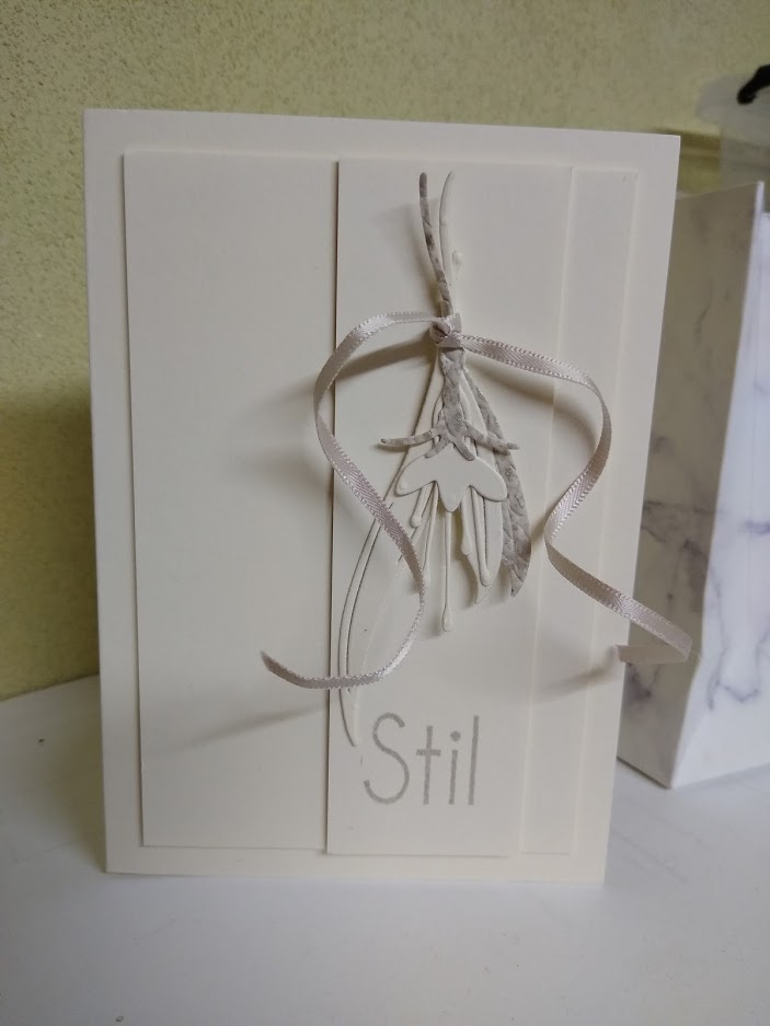Ik vond inspiratie op Pinterest, zoals nogal eens dikwijls...Ik gebruikte voornamelijk snijmallen en een tekststempel van bij Elke. Eén deel op de voorkant en de rest van het tekstje is aan de binnenkant gestempeld.
